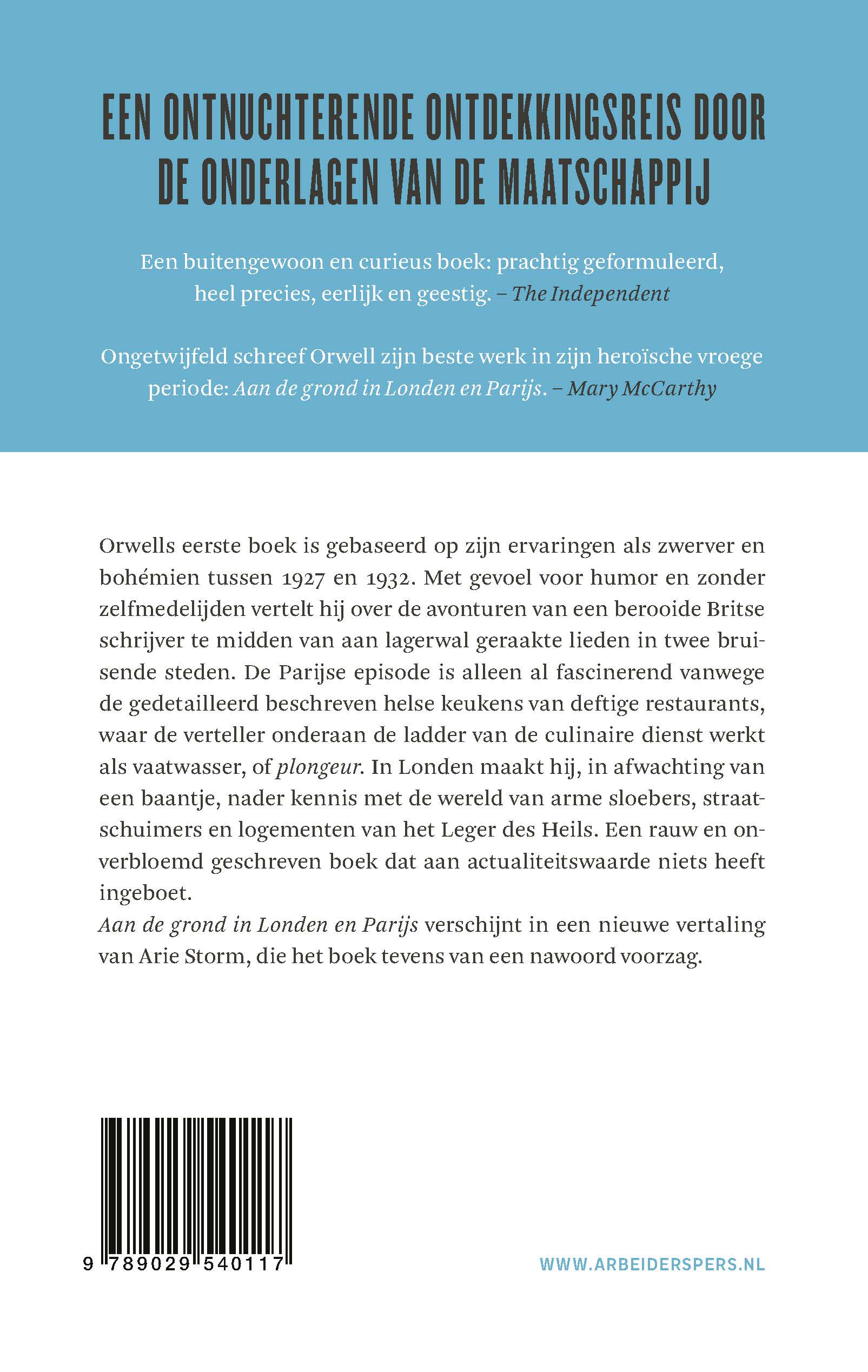 Armoede en menselijk drijfhoutOrwells eerste boek is gebaseerd op zijn ervaringen als zwerver en bohémien tussen 1927 en 1932. Met gevoel voor humor en zonder zelfmedelijden vertelt hij over de avonturen van een berooide Britse schrijver te midden van aan lagerwal geraakte lieden in twee bruisende steden. De Parijse episode is alleen al fascinerend vanwege de gedetailleerd beschreven helse keukens van deftige restaurants, waar de verteller onder aan de ladder van de culinaire dienst werkt als vaatwasser, of plongeur. In London maakt hij, in afwachting van een baantje, nader kennis met de wereld van arme sloebers, straatschuimers en logementen van het Leger des Heils.