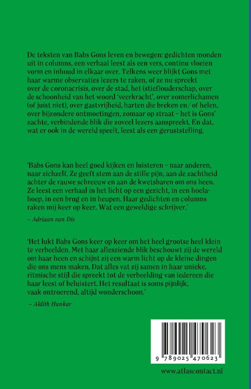 Telkens weer blijkt Babs Gons je met haar warme observaties te raken, of ze nu spreekt over de coronacrisis, over de stad, het (stief)ouderschap, over de schoonheid van het woord ‘veerkracht’, over zomerlichamen (of juist niet), over gastvrijheid, harten die breken en/of helen, over bijzondere ontmoetingen, zomaar op straat – het is haar zachte, verbindende blik die zoveel lezers aanspreekt. En dat, wat er ook in de wereld speelt, leest als een geruststelling. De teksten van Babs Gons in ‘Alles wat je liefhebt wordt mooi’ leven en bewegen: gedichten monden uit in columns, een verhaal leest als een vers, continu vloeien vorm en inhoud in elkaar over. Met verbindende taal beschouwt Gons de wereld en geeft stem aan wat vaak onzichtbaar blijft.