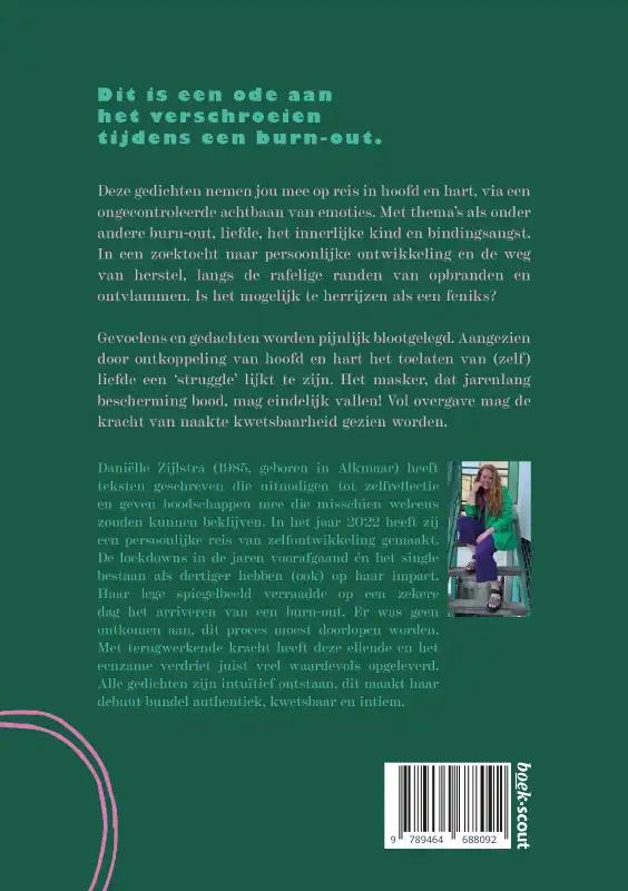 Dit is een ode aan het verschroeien tijdens een burn-out. Deze gedichten nemen jou mee op reis in hoofd en hart, via een ongecontroleerde achtbaan van emoties. Met thema’s als onder andere burn-out, liefde, het innerlijke kind en bindingsangst. In een zoektocht naar persoonlijke ontwikkeling en de weg van herstel, langs de rafelige randen van opbranden en ontvlammen. Is het mogelijk te herrijzen als een feniks?Gevoelens en gedachten worden pijnlijk blootgelegd. Aangezien door ontkoppeling van hoofd en hart het toelaten van (zelf)liefde een ‘struggle’ lijkt te zijn. Het masker, dat jarenlang bescherming bood, mag eindelijk vallen! Vol overgave mag de kracht van naakte kwetsbaarheid gezien worden.