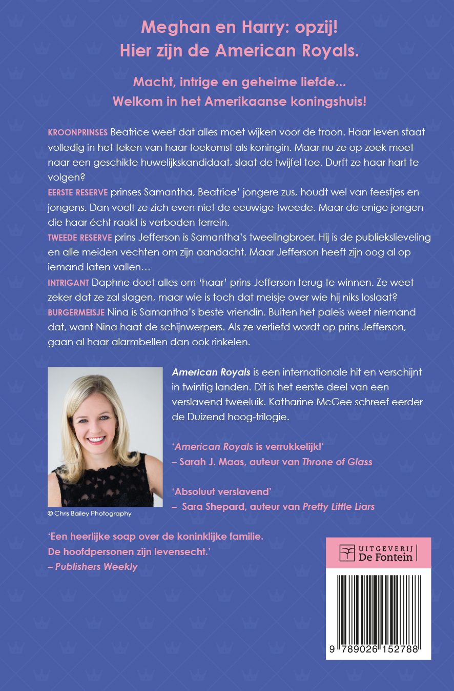 American Royalsis het eerste deel van deze verslavende serie vol drama en romantiek. The Crown meets Gossip Girl in dit sprankelende verhaal van bestsellerauteur Katharine McGee. Smullen voor jongeren vanaf 15 jaar én volwassen lezers.Welkom bij het Amerikaanse koningshuis, waar intriges en verboden liefde de kroon dreigen te ondermijnen:KROONPRINSES Beatrice: weet dat alles moet wijken voor de kroon. Nu ze op zoek moet naar een huwelijkskandidaat, slaat de twijfel toe.EERSTE RESERVE prinses Samantha: houdt wel van een feestje.INTRIGANT Daphne: doet alles om prins Jefferson terug te winnen.BURGERMEISJE Nina: steelt ongewild de show als ze voor de prins valt.Wint liefde het van plicht en traditie?American Royals is wereldwijd lovend ontvangen, ook in Nederland. Inmiddels is ook het tweede deel, Majesteit, verschenen. ‘Extreem verslavend. Ik zat er vanaf de eerste pagina’s meteen helemaal in.’ Books and dreams’American Royals is de ultieme guilty pleasure die je niet mag missen.’ Serendipity Books’Een heerlijk verhaal over de koninklijke familie. De hoofdpersonen zijn levensecht door hun zwakke plekken.’ Publishers Weekly