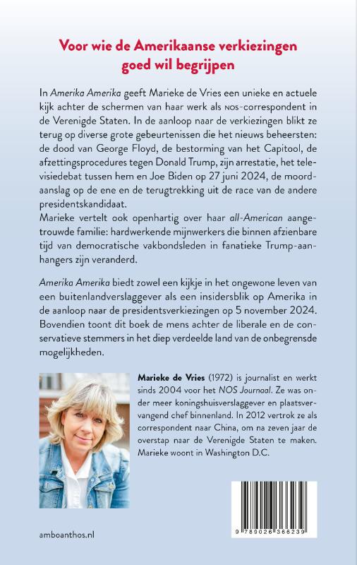 Voor wie de Amerikaase verkiezingen goed wil begrijpenIn de aanloop naar de verkiezingen blikt Marieke de Vries terug op diverse grote gebeurtenissen die het nieuws beheersten: de dood van George Floyd, de bestorming van het Capitool, de afzettingsprocedures tegen Donald Trump, zijn arrestatie, het televisiedebat tussen hem en Joe Biden op 27 juni 2024, de moordaanslag op de ene en de terugtrekking uit de race van de andere presidentskandidaat.Marieke vertelt ook openhartig over haar all-American aangetrouwde familie: hardwerkende mijnwerkers die binnen afzienbare tijd van democratische vakbondsleden in fanatieke Trump-aanhangers zijn veranderd.Amerika Amerika biedt zowel een kijkje in het ongewone leven van een buiten landverslaggever als een insidersblik op Amerika in de aanloop naar de presidentsverkiezingen op 5 november 2024. Bovendien toont dit boek de mens achter de liberale en de conservatieve stemmers in het diep verdeelde land van de onbegrensde mogelijkheden.’De Vries geeft met Amerika Amerika alvast een sterk onderbouwde en glasheldere opeenstapeling van feiten die je in de aanloop hiernaar niet kunt missen.’ – Boekenkrant