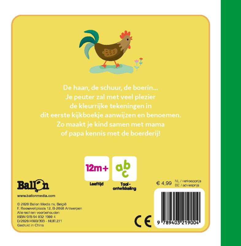 De haan, de schuur, de boerin…Je peuter zal met veel plezier de kleurrijke tekeningen in dit eerste kijkboekje aanwijzen en benoemen. Zo maakt je kind samen met mama of papa kennis met de boerderij!Dankzij de zachte mousse cover en afgeronde hoekjes is dit kijkboekje ideaal voor kleine handjes.