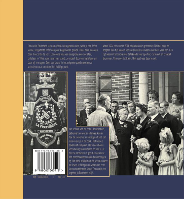 Concordia Brummen leek op afstand een gewoon café, waar je een feest vierde, vergaderde en/of een paar kegelballen gooide. Maar deze woorden doen Concordia te kort. Concordia was van oorsprong een sociëteit, ontstaan in 1865, voor heren van stand. Je moest door een ballotage om daar bij te mogen. Door een brand in het originele pand moesten ze verhuizen en zo ontstond het huidige pand. Vanaf 1924 tot en met 2018 zwaaiden drie generaties Timmer daar de scepter. Een tijd waarin veel veranderde en waarin ook heel veel kon. Een tijd waarin Concordia veel betekende voor sportief, cultureel en creatief Brummen. Van groot tot klein. Niet veel was daar te gek. Het verhaal van dit pand, de bewoners, gebruikers en wat er allemaal kon en hoe de toekomst er hopelijk uit ziet. Dat lees en zie je in dit boek. Het boek is zeker niet compleet. Het is een bonte verzameling van verhalen en foto’s. Uit diverse archieven is geput en een keur aan dorpsbewoners halen herinneringen op. Dit boek prikkelt om de verhalen weer tot leven te brengen en vooral om ze te laten voortbestaan, zodat Concordia een legende in Brummen blijft.
