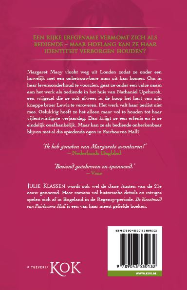 Bij ‘De dienstmeid van Fairbourne Hall’ van Julie Klassen zwijmelden al vele lezers weg. Margaret Macy vlucht weg uit Londen om onder een huwelijk met een onbetrouwbare man uit te komen. Om in haar onderhoud te voorzien gaat ze aan het werk als bediende in het huis van Nathaniel Upchurch, een vrijgezel die ze ooit afwees in de hoop het hart van zijn knappe broer te veroveren. Als ze het volhoudt tot haar verjaardag, zal ze een erfenis van een oudtante krijgen. Maar kan ze als bediende onherkenbaar blijven als er meer spiedende ogen te gast blijken te zijn op Fairbourne Hall?’Ik heb genoten van Margarets avonturen!’ – Nederlands Dagblad