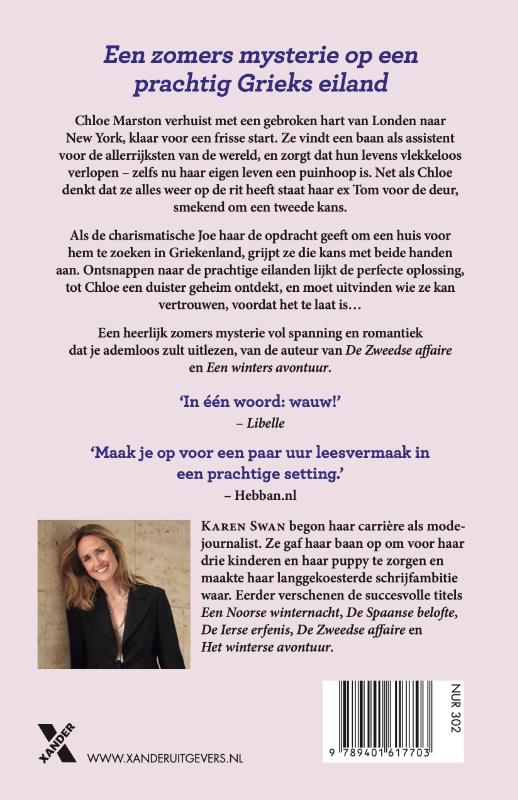 In De Griekse ontsnapping van Karen Swan, bekend van o.a. de bestsellers De Zweedse affaire en De Spaanse belofte, verhuist Chloe Marston met een gebroken hart van Londen naar New York, klaar voor een frisse start. Ze vindt een baan als assistent voor de allerrijksten van de wereld, en zorgt dat hun levens vlekkeloos verlopen – zelfs nu haar eigen leven een puinhoop is. Net als Chloe denkt dat ze alles weer op de rit heeft staat haar ex Tom voor de deur, smekend om een tweede kans.Als de charismatische Joe haar de opdracht geeft om een huis voor hem te zoeken in Griekenland, grijpt ze die kans met beide handen aan. Ontsnappen naar de prachtige eilanden lijkt de perfecte oplossing, tot Chloe een duister geheim ontdekt, en moet uitvinden wie ze kan vertrouwen, voordat het te laat is…Een heerlijk zomers mysterie vol spanning en romantiek dat je ademloos zult uitlezen, van de auteur van De Zweedse affaire en Een winters avontuur.‘In één woord: wauw!’ ‒ Libelle‘Maak je op voor een paar uur leesvermaak in een prachtige setting!’ – Hebban.nl‘Mysterieus en geheimzinnig, met een vleugje romantiek.’ – Nailglossleest‘Een heerlijk boek om mee te nemen op vakantie of lekker in je tuin/op het balkon te lezen!’ – Bookaholic