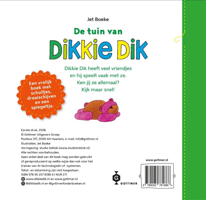‘De tuin van Dikkie Dik’ is een stevig kartonboek met schuifjes, draaischijf en spiegeltje, speciaal voor de jongste fans van de beroemdste oranje kat van Nederland.
