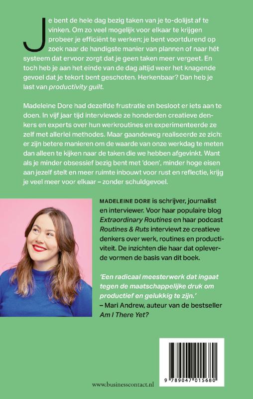 In ‘Dingen die je vandaag niet hoeft te doen’ vertelt Madeleine Dore hoe het kan dat je de hele dag bezig bent taken van je to-dolijst af te vinken. Om zo veel mogelijk voor elkaar te krijgen probeer je efficiënt te werken; je bent voortdurend op zoek naar de handigste manier van plannen of naar hét systeem dat ervoor zorgt dat je geen taken meer vergeet. En toch heb je aan het einde van de dag altijd weer het knagende gevoel dat je tekort bent geschoten. Herkenbaar? Dan heb je last van ‘productivity guilt’.Madeleine Dore had dezelfde frustratie en besloot er iets aan te doen. In vijf jaar tijd interviewde ze honderden creatieve denkers en experts over hun werkroutines en experimenteerde ze zelf met allerlei methodes. Maar gaandeweg realiseerde ze zich: er zijn betere manieren om de waarde van onze werkdag te meten dan alleen te kijken naar de taken die we hebben afgevinkt. Want als je minder obsessief bezig bent met ‘doen’, minder hoge eisen aan jezelf stelt en meer ruimte inbouwt voor rust en reflectie, krijg je veel meer voor elkaar – zonder schuldgevoel.