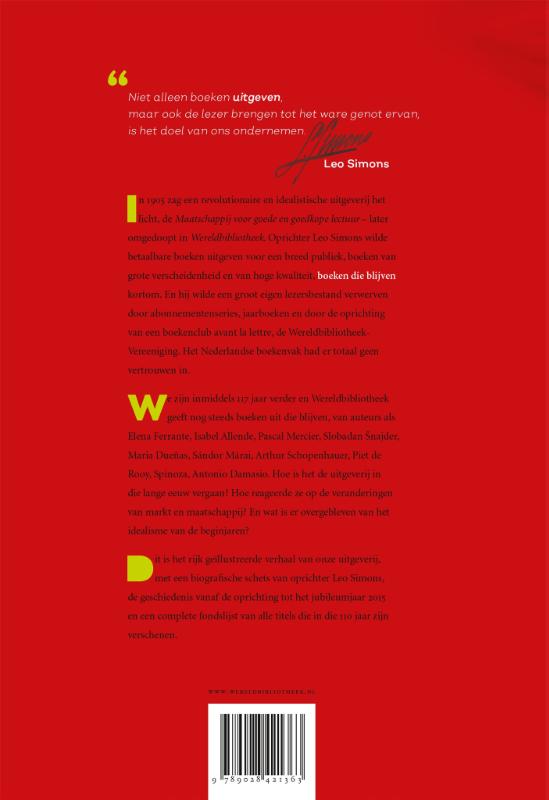 Een rijk geïllustreerde biografie van Wereldbibliotheek: opgericht als revolutionaire en idealistische uitgeverij, tegen het sterk veranderende tijdsbeeld van de twintigste eeuw. In 1905 begon Leo Simons met een revolutionaire en idealistische uitgeverij, de ‘Maatschappij tot verspreiding van goede en goedkoope lectuur’, later omgedoopt in ‘Wereldbibliotheek’, naar een van de series. Simons wilde betaalbare boeken uitgeven voor een breed publiek, boeken van grote verscheidenheid en hoge kwaliteit qua inhoud en uitvoering. En hij wilde een groot eigen lezersbestand verwerven door abonnementenseries, jaarboeken, tentoonstellingen bij bedrijven met veel werknemers en een boekenclub avant la lettre, de Wereldbibliotheek-Vereeniging. De Nederlandse boekenwereld had er totaal geen vertrouwen in.Hoe ging Wereldbibliotheek om met de scepsis en tegenwerking uit het boekenvak? Hoe reageerde de uitgeverij op de veranderingen van markt en maatschappij? En werd de ‘ideële’ uitgeverij ten langen leste niet een ‘gewone’ uitgeverij? In vier delen wordt antwoord gegeven op deze vragen. Deel I is een biografische schets van oprichter Leo Simons, deel II behandelt de fondsontwikkeling van de uitgeverij van 1905 tot 2005, deel III de fondsontwikkeling van 2006 tot en met 2015, deel iv is de complete fondslijst van 110 jaar. In de delen II en III komen ook de plaats in de markt, de bedrijfseconomische kanten en de positie in het Nederlandse en het Vlaamse boekenvak aan de orde; en op de achtergrond krijgt de lezer een tijdsbeeld van de twintigste eeuw.Elena Ferrante, Isabel Allende, Pascal Mercier, Slobodan Šnajder, Maria Duenas, Sandor Marai, Arthur Schopenhauer, Piet de Rooy, Spinoza, Antonio Damasio, om maar eens een paar namen te noemen. Een greep uit de auteurs van Wereldbibliotheek, die boekhandelaren sinds jaar en dag omzet, lezers leesplezier en critici verrukking brengen. Want dat doet Wereldbibliotheek al 116 jaar: eigenzinnig, onafhankelijk, wars van de waan van de dag auteurs uitgeven van boeken die blijven.