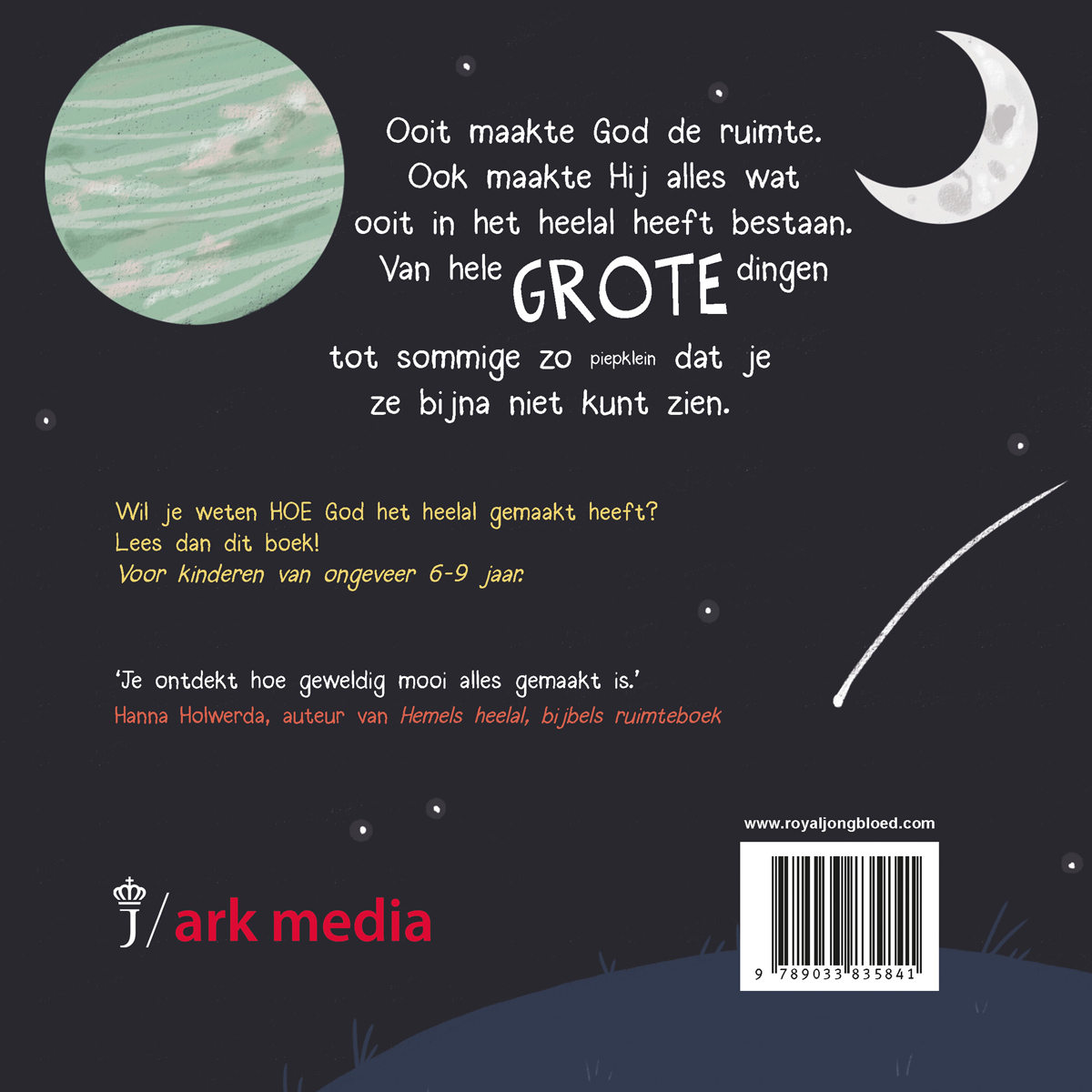 Ooit maakte God de ruimte. Ook maakte Hij alles wat ooit in het heelal heeft bestaan. Van hele GROTE dingen tot sommige zo piepklein dat je ze bijna niet kunt zien. Dit prachtige prentenboek vertelt op een enthousiaste, eenvoudige en informatieve manier over de ruimte, sterren en planeten. De belangrijkste inzichten vanuit de wetenschap komen aan bod. Jonge kinderen zullen tijdens het (voor)lezen steeds meer verwonderd raken over God de Schepper. Het boek sluit af met een paar relevante doe-suggesties. Een eerste ontdekkingstocht naar het heelal voor nieuwsgierige kinderen van ongeveer 6-9 jaar.