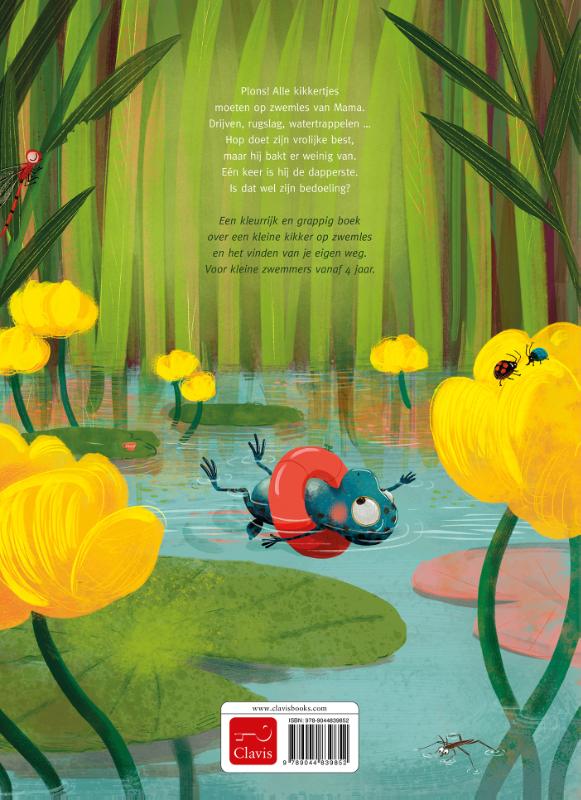 Plons! Alle kikkertjes moeten op zwemles van Mama. Drijven, rugslag, watertrappelen … Hop doet zijn vrolijke best, maar hij bakt er weinig van. Eén keer is hij de dapperste. Is dat wel zijn bedoeling? Een kleurrijk en grappig boek over een kleine kikker op zwemles en het vinden van je eigen weg. Voor kleine zwemmers vanaf 4 jaar.