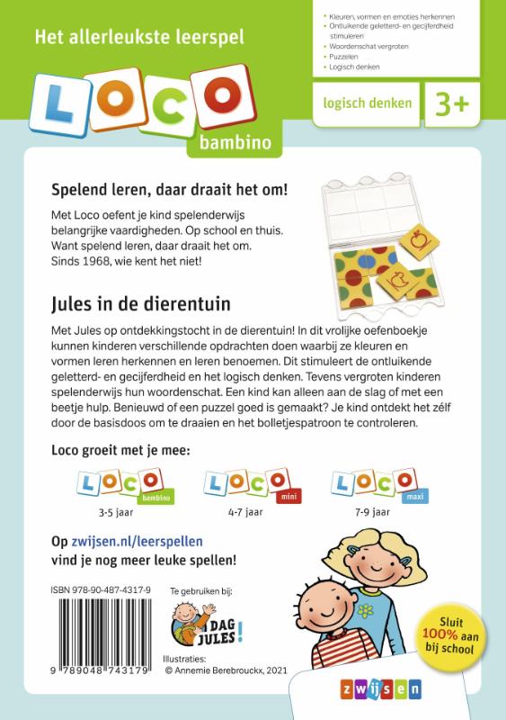Met Jules op ontdekkingstocht in de dierentuin! In dit vrolijke oefenboekje kunnen kinderen verschillende opdrachten doen waarbij ze kleuren en vormen leren herkennen en leren benoemen. De ontluikende geletterd- en gecijferdheid en het logisch denken worden zo gestimuleerd. Tevens vergroten kinderen spelenderwijs hun woordenschat. Een kind kan alleen aan de slag of met een beetje hulp. Benieuwd of een puzzel goed is gemaakt? Je kind ontdekt het zélf door de basisdoos om te draaien en het bolletjespatroon te controleren.Deze Loco uitgave is te gebruiken bij de methode Dag Jules!Leerdoelen:• Herkennen en benoemen van kleuren en vormen• Stimuleren van de ontluikende geletterd- en gecijferdheid• Herkennen en benoemen van emoties• Vergroten van de woordenschat• Puzzelen• Logisch denkenMet Loco oefent je kind spelenderwijs belangrijke vaardigheden. Op school en thuis. Want spelend leren, daar draait het om. Sinds 1968, wie kent het niet!