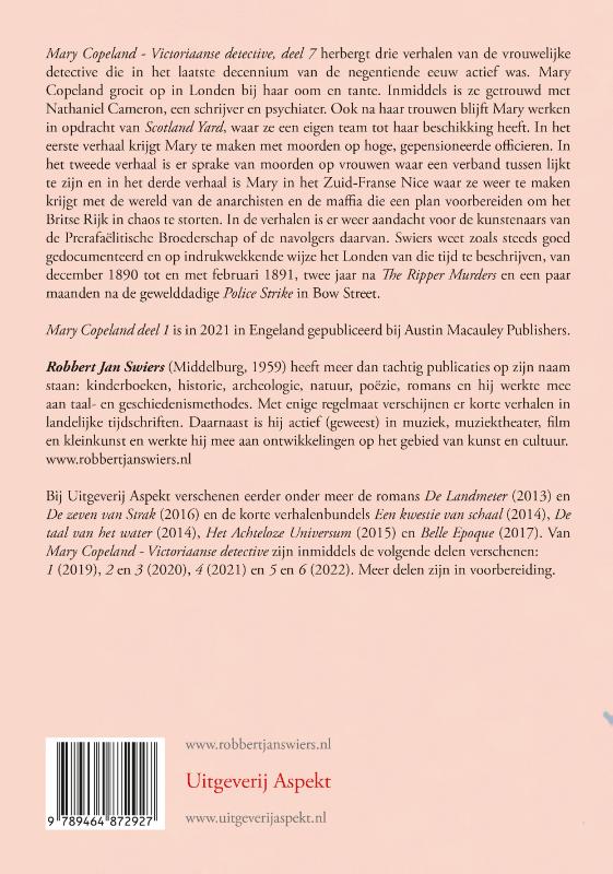 Mary Copeland – Victoriaanse detective, deel 7 herbergt drie verhalen van de vrouwelijke detective die in het laatste decennium van de negentiende eeuw actief was. Mary Copeland groeit op in Londen bij haar oom en tante. Inmiddels is ze getrouwd met Nathaniel Cameron, een schrijver en psychiater. Ook na haar trouwen blijft Mary werken in opdracht van Scotland Yard, waar ze een eigen team tot haar beschikking heeft. In het eerste verhaal krijgt Mary te maken met moorden op hoge, gepen­sioneerde officieren. In het tweede verhaal is er sprake van moorden op vrouwen waar een verband tussen lijkt te zijn en in het derde verhaal is Mary in het Zuid-Franse Nice waar ze weer te maken krijgt met de wereld van de anarchisten en de maffia die een plan voorbereiden om het Britse Rijk in chaos te storten. In de verhalen is er weer aandacht voor de kunste­naars van de Prerafaëlitische Broederschap of de navolgers daarvan. Swiers weet zoals steeds goed gedocumenteerd en op indrukwekkende wijze het Londen van die tijd te beschrijven, van december 1890 tot en met februari 1891, twee jaar na The Ripper Murders en een paar maanden na de gewelddadige Police Strike in Bow Street. Mary Copeland deel 1 is in 2021 in Engeland gepubliceerd bij Austin Macauley Publishers. Robbert Jan Swiers (Middelburg, 1959) heeft meer dan tachtig publicaties op zijn naam staan: kinderboeken, historie, archeologie, natuur, poëzie, romans en hij werkte mee aan taal- en geschiedenismethodes. Met enige regelmaat verschijnen er korte verhalen in landelijke tijdschriften. Daar­naast is hij actief (geweest) in muziek, muziektheater, film en kleinkunst en werkte hij mee aan ontwikkelingen op het gebied van kunst en cultuur. www.robbertjanswiers.nl Bij Uitgeverij Aspekt verschenen eerder onder meer de romans De Land­meter (2013) en De zeven van Strak (2016) en de korte verhalenbundels Een kwestie van schaal (2014), De taal van het water (2014), Het Achteloze Universum (2015) en Belle Epoque (2017). Van Mary Copeland – Victori­aanse detective zijn inmiddels de volgende delen verschenen: 1 (2019), 2 en 3 (2020), 4 (2021) en 5 en 6 (2022). Meer delen zijn in voorbereiding.