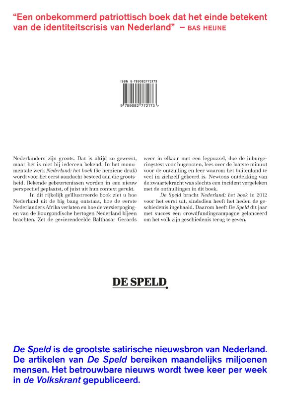 Nederlanders zijn groots. Dat is altijd zo geweest, maar het is niet bij iedereen bekend. In het monumentale werk Nederland: het boek (5e herziene druk) wordt voor het eerst aandacht besteed aan die grootsheid. Bekende gebeurtenissen worden in een nieuw perspectief geplaatst, of juist uit hun context gerukt.In dit rijkelijk geïllustreerde boek ziet u hoe Nederland uit de big bang ontstaat, hoe de eerste Nederlanders Afrika verlaten en hoe de versierpogingen van de Bourgondische hertogen Nederland bijeen brachten. Zet de gevierendeelde Balthasar Gerards weer in elkaar met een legpuzzel, doe de inburgeringstest voor hugenoten, lees over de laatste minuut voor de ontzuiling en leer waarom het buitenland te veel in zichzelf gekeerd is. Newtons ontdekking van de zwaartekracht was slechts een incident vergeleken met de onthullingen in dit boek.De Speld bracht Nederland: het boek in 2012 voor het eerst uit, sindsdien heeft het heden de geschiedenis ingehaald. Daarom heeft De Speld dit jaar met succes een crowdfundingcampagne gelanceerd om het volk zijn geschiedenis terug te geven.