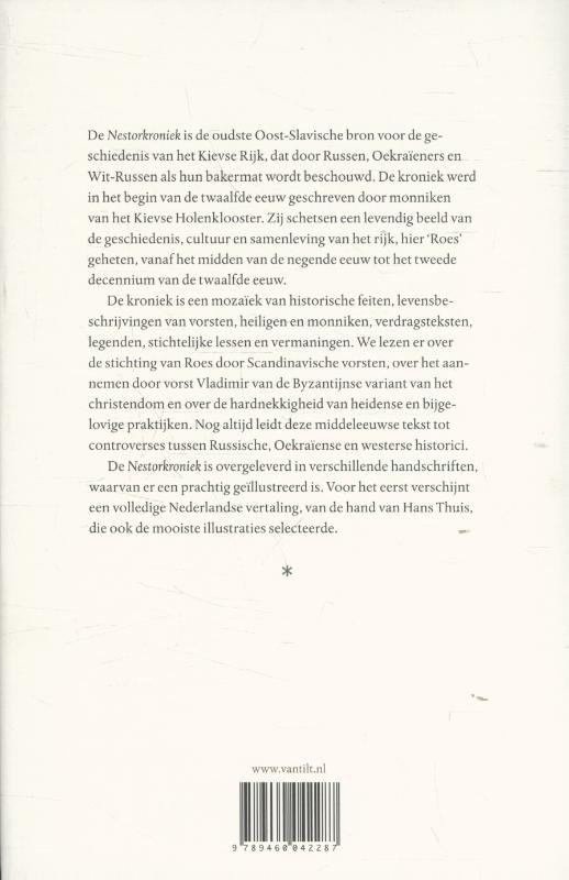 De Nestorkroniek is de oudste Oost-Slavische bron voor de geschiedenis van het Kievse Rijk, dat door Russen, Oekraïners en Wit-Russen als hun bakermat wordt beschouwd. De kroniek is in het begin van de twaalfde eeuw geschreven door monniken van het Kievse Holenklooster. Zij schetsen een levendig beeld van de geschiedenis, cultuur en samenleving van het rijk, hier ‘Roes’ geheten, vanaf het midden van de negende eeuw tot het tweede decennium van de twaalfde eeuw.De kroniek is een mozaïek van historische feiten, levensbeschrijvingen van vorsten, heiligen en monniken, verdragsteksten, legenden, stichtelijke lessen en vermaningen. We lezen er onder andere over de stichting van Roes door Scandinavische vorsten, over het aannemen door vorst Vladimir van de Byzantijnse variant van het christendom en over de hardnekkigheid van heidense en bijgelovige praktijken. Nog altijd leidt deze middeleeuwse tekst tot controverses tussen Russische, Oekraïense en westerse historici.De Nestorkroniek is overgeleverd in verschillende handschriften, waarvan er een prachtig geïllustreerd is. Voor het eerst verschijnt een volledige Nederlandse vertaling, van de hand van Hans Thuis, die ook de mooiste illustraties selecteerde.