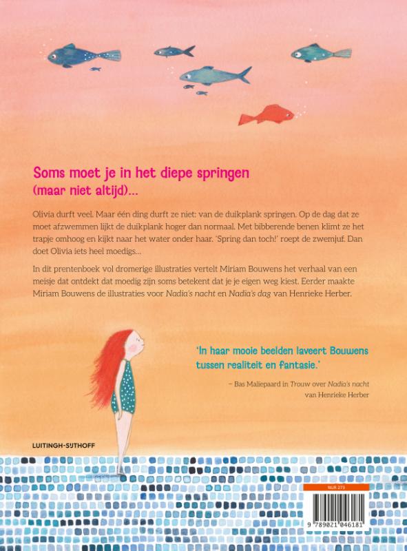 Olivia durft alles. Maar in Olivia durft, het betoverende prentenboekendebuut van illustrator Miriam Bouwens, ontdekt ze tijdens zwemles dat er iets is wat ze niet durft. Een heerlijk eigenwijs prentenboek met een belangrijk thema: je grenzen durven aangeven.Olivia zit op zwemles. Drijven op haar rug, watertrappelen en onder water zwemmen als een vis – ze kan het allemaal. Maar van de duikplank springen durft ze niet. Op de dag dat ze moet afzwemmen lijkt de duikplank nog hoger dan normaal. Langzaam klimt ze het trapje omhoog, haar benen bibberen. Dan doet ze iets heel moedigs…In dromerige zinnen en betoverende illustraties vertelt Miriam Bouwens het verhaal van een meisje dat ontdekt dat moedig zijn soms betekent dat je je eigen weg kiest.‘In haar mooie beelden laveert Bouwens tussen realiteit en fantasie.’Bas Maliepaard, Trouw