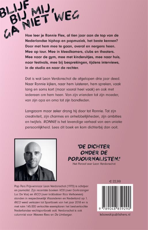 Hoe leer je Ronnie Flex, al tien jaar aan de top van de Nederlandse hiphop en popmuziek, het beste kennen? Door met hem mee te gaan, overal en nergens heen. Mee op tour. Mee in kleedkamers, clubs en theaters. Mee naar de gym, mee met kinderuitjes, mee naar huis, naar festivals, mee bij besprekingen, tijdens interviews, in de studio en naar de rechter.Dat is wat Leon Verdonschot de afgelopen drie jaar deed. Naar Ronnie kijken, naar hem luisteren, hem spreken, vaak lang en soms kort (maar vooral heel vaak) en ook met iedereen om hem heen. Van zijn vrienden tot zijn moeder, van zijn opa en oma tot zijn bandleden.Langzaam maar zeker drong hij door tot Ronnie. Tot zijn creativiteit, zijn charmes en onhebbelijkheden, zijn ambities en twijfels. RONNIE is het levendige verhaal van een unieke persoonlijkheid. Lees dit boek en kom dichterbij dan ooit.