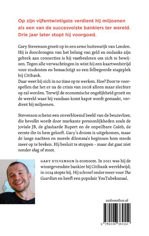 ‘Dit is een zeldzame inkijk in de wereld van haute finance in Londen, alleen al omdat Gary Stevenson daadwerkelijk voor een zakenbank werkt en de code of silence daar onverschrokken doorbreekt’ – Joris Luyendijk’Hier het verhaal van de manier waarop ik, van alle jongeren die in de schaduwen van de wolkenkrabbers voetbalden en snoep verkochten, een baan op de beursvloer van de Citibank kreeg. Hoe ik de meest winstgevende trader van de hele wereld werd, en ik vertel ook waarom ik er, na dat alles, de brui aan gaf.”Gary Stevenson groeit op in een arme buitenwijk van Londen, doordrongen van het belang van geld en vastbesloten om zich te bewijzen. Hij mist de noodzakelijke connecties maar wint tegen alle verwachtingen in een kaartwedstrijd voor studenten en bemachtigt zo een felbegeerde stageplek bij Citibank.Daar weet hij zich in no time op te werken. Hoe? Door te voorspellen dat het er na de crisis van 2008 alleen maar slechter op zou worden. Terwijl de economische ongelijkheid groeit en de wereld waar hij vandaan komt kapot wordt gemaakt, verdient hij miljoenen.Stevenson schetst een onverbloemd beeld van de beursvloer, die bevolkt wordt door markante persoonlijkheden zoals de joviale JB, de glasharde Rupert en de onpeilbare Caleb, de eerste die in Gary gelooft. Zijn droom is uitgekomen, maar de lange nachten en morele dilemma’s beginnen hem steeds meer op te breken. Tot hij besluit te stoppen – maar dat gaat niet zonder slag of stoot.