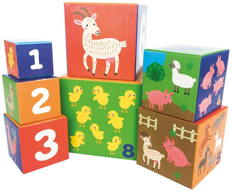 Reuzeleuke stapelblokken met cijfers, dieren van de boerderij, hoeveelheden en vormen. Als je kind de blokken op de juiste manier stapelt, komt er op de vijfde zijde een mooie verticale tekening tevoorschijn.Vanaf 12 maanden