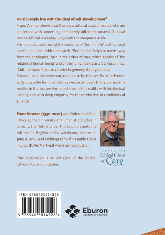Do all individuals embrace the ideal of self-development in their lives?Frans Vosman argues that there exists a cultural group of people who prioritize something entirely different: survival. Survival entails coping with the harsh realities of daily life and the challenges it presents.Vosman advocates for the use of the concepts of “form of life” and “cultural class” in political-ethical research. “Form of life” allows us to move away from the ontological focus in care ethics, which emphasizes the interconnectedness of human beings and their inherent caregiving nature. “Cultural class” helps to challenge hegemonic ideals.Survival, as a phenomenon, is so pervasive that we often fail to recognize it as a way of life. Our fixation on ideals blinds us to this reality. In this lecture, Vosman skillfully sheds light on this reality, offering intellectual clarity and deep empathy for those living under conditions of survival.Frans Vosman (1952–2020) was a Professor of Care Ethics at the University of Humanistic Studies in Utrecht, the Netherlands. This book includes the complete English text of his valedictory lecture delivered on June 15, 2018, along with a bibliography of his English publications. The introduction is written by Per Nortvedt.