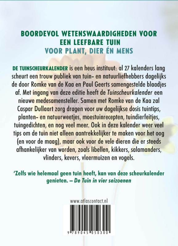 De Tuinscheurkalender is een heus instituut: al 27 kalenders lang scheurt een trouw publiek van tuinen natuurliefhebbers dagelijks de door Romke van de Kaa en Paul Geerts samengestelde kalenderblaadjes af. Met ingang van deze editie heeft de Tuinscheurkalender een nieuwe samensteller. Met Romke van de Kaa zal Caspar Dullaart zorg dragen voor uw dagelijkse dosis tuintips, plantenweetjes, moestuinrecepten, tuindierfeitjes, tuingedichten (en nog veel meer). Ook in deze editie weer veel tips om de tuin niet alleen aantrekkelijker te maken voor het oog (en voor de maag), maar ook voor de vele nuttige dieren die er steeds afhankelijker van worden, zoals bijen, padden, salamanders, vlinders, vleermuizen en vogels. De unieke scheurkalender staat weer boordevol wetenswaardigheden voor een leefbare tuin voor plant, dier én mens.