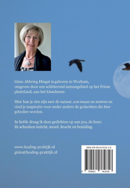 Ginie Abbring Hingst is geboren in Workum, omgeven door een schitterend natuurgebied op het Friese platteland, aan het IJsselmeer.Hier kun je één zijn met de natuur, zon maan en sterren en vind je inspiratie voor onder andere de gedachten die hier geboden worden.In liefde draag ik deze gedichten op aan jou, de lezer. Ze schenken inzicht, moed, kracht en bezieling.