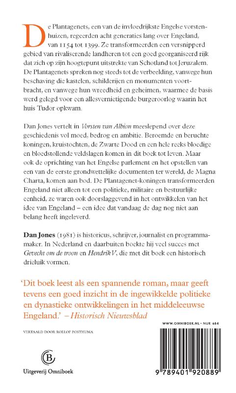 ‘Vorsten van Albion’ van Dan Jones is een kroniek van acht generaties van de beste en slechtste koningen en koninginnen die Engeland ooit heeft gekend. Ze maakten deel uit van het huis Plantagenet, en hun geschiedenis is die van Engeland en Groot-Brittannië. Deze eerste koninklijke dynastie van Engeland heerste ruim driehonderd jaar over Albion, van 1154 tot 1485. De van oorsprong uit Anjou afkomstige vorsten zorgden ervoor dat Engeland uit de middeleeuwen tevoorschijn kwam als een zeer georganiseerd rijk, dat heerste van Schotland tot Jeruzalem.