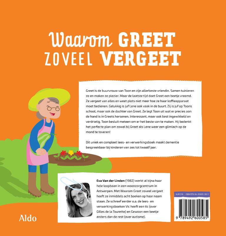 Greet is de buurvrouw van Toon en zijn allerbeste vriendin. Samen tuinieren ze en maken ze plezier. Maar de laatste tijd doet Greet een beetje vreemd. Ze vergeet van alles en weet plots niet meer hoe ze haar koffieapparaat moet bedienen. Gelukkig is juf Lene ook vaak in de buurt. Zij is juf op Toons school, maar ook de dochter van Greet. Ze legt Toon uit wat er precies aan de hand is in Greets hersenen. Interessant, maar ook best ingewikkeld en verdrietig. Toon besluit meteen om er het beste van te maken. Hij bedenkt het perfecte plan om zowel bij Greet als Lene weer een glimlach op de mond te toveren!Dit uniek en compleet lees- en verwerkingsboek maakt dementie bespreekbaar bij kinderen van zes tot twaalf jaar.