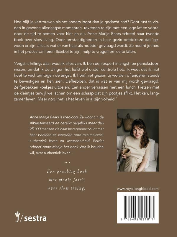 Hoe blijf je vertrouwen als het anders loopt dan je gedacht had? Rust vinden in gewone alledaagse momenten, tevreden zijn met minder en vooral leven vanuit je hart. Anne Marije Baars schreef haar tweede boek over slow living. Door omstandigheden in haar gezin werd ze geroepen om als moeder aanwezig te zijn. Ze neemt je mee in het proces van leren flexibel te zijn, hulp te vragen en los te laten. ‘Angst is killing. Daar weet ik alles van, want expert in angst- en paniekstoornissen omdat ik de dingen het liefst wel onder controle heb. Ik weet dat ik niet hoef te vechten tegen de angst. Ik hoef niet gezien te worden of anderen steeds te bevestigen en ze zien. Ik hoef allen maar lief te hebben. Zelfgebakken koekjes uitdelen. Een ander verrassen met een lunch. Fietsen met de kleintjes terwijl we lachen om een schaap die zijn pootjes aflikt.’Anne Marije Baars Een prachtig boek met mooie foto’s over aanwezig leven.