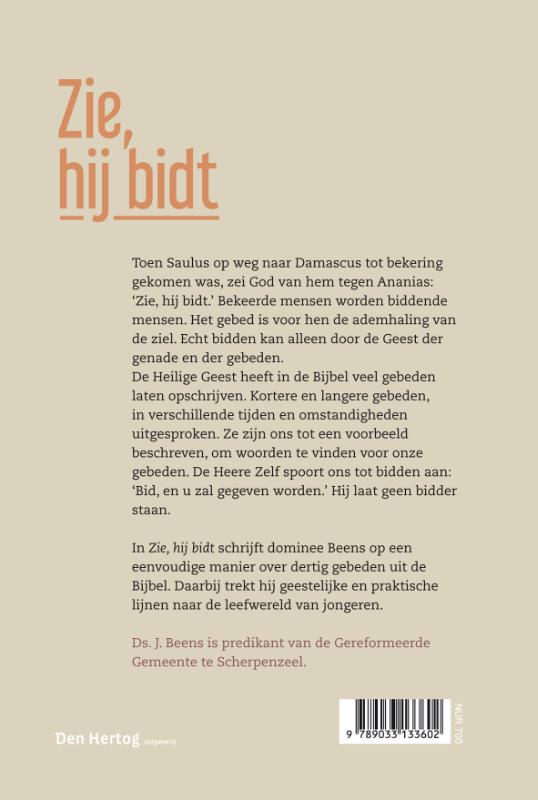 In ‘Zie, hij bidt’ schrijft dominee Beens op eenvoudige, aansprekende manier over dertig gebeden uit de Bijbel. Daarbij trekt hij geestelijke en praktische lijnen naar de leefwereld van jongeren.
